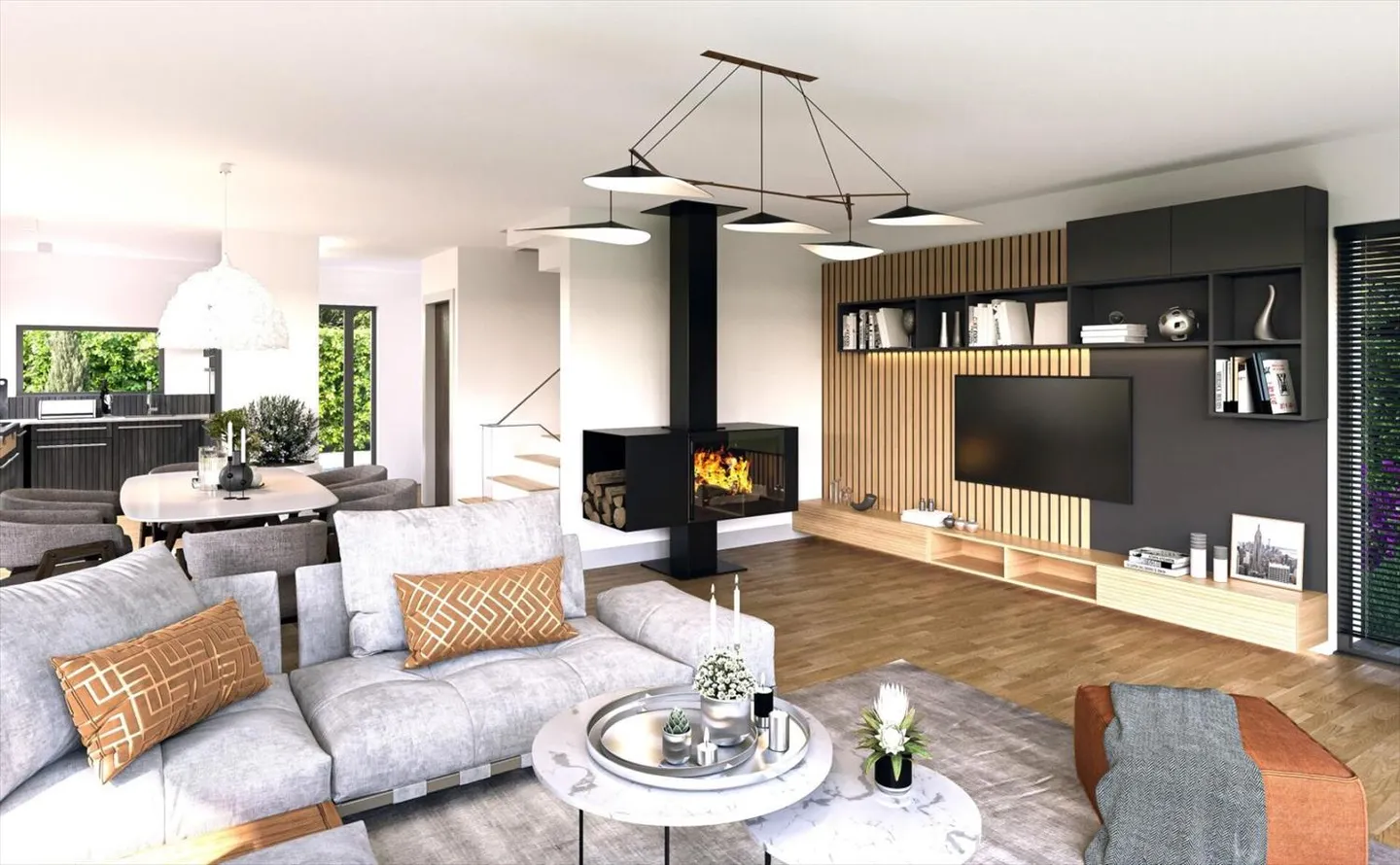 * eine offene Küche mit Blick auf das Esszimmer