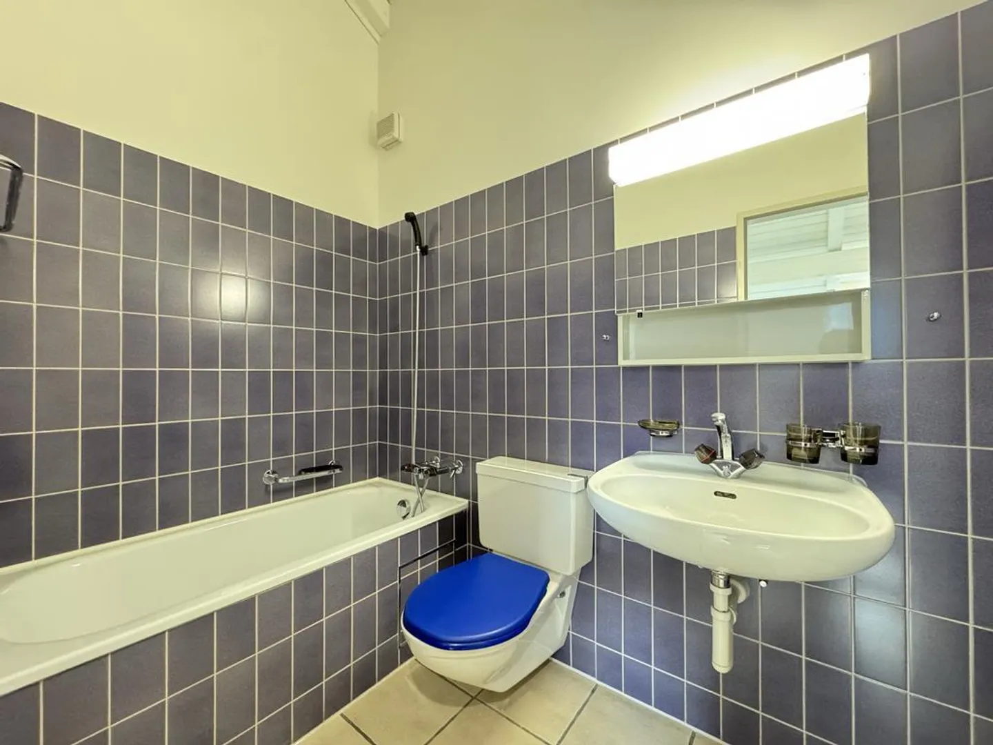 * A bathroom with bathtub, toilet, mirror cabinet, and washbasin