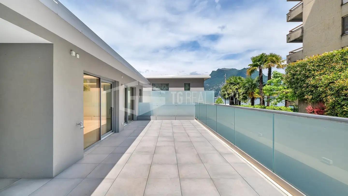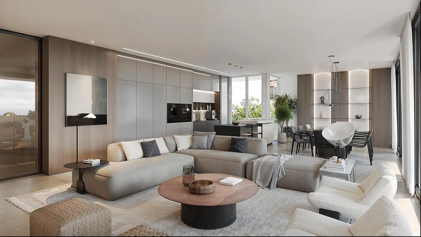 A Gentilino - Collina d'Oro, un appartamento di 4,5 stanze con una superficie commerciale di 252 m² e un giardino privato di 572 m² è in vendita nella nuova ed elegante Residenza Golden Hill.